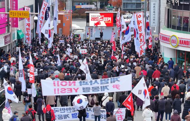 12·3 불법 계엄을 '계몽령'으로 평가하며 계엄 사과가 필요 없다는 내용을 담은 현수막이 30일 강원 춘천시청 인근에서 열린 국민의힘 민생회복 법치수호 국민대회에 등장해 있다 춘천=연합뉴스 |