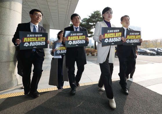 더불어민주당 3대특검종합대응특위 소속 전현희 최고위원을 포함한 의원들이 24일 서울 서초구 내란특검 사무실이 마련된 서울고검으로 향하고 있다. 왼쪽부터 장경태 의원, 김한나 서초구 갑 지역위원장, 이성윤, 전현희, 김병주 의원. 연합뉴스 |