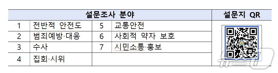 설문조사 문항은 시민이 생활 속에서 느끼는 안전 수준과 범죄 예방·수사 등 7개 분야로 구성됐다.