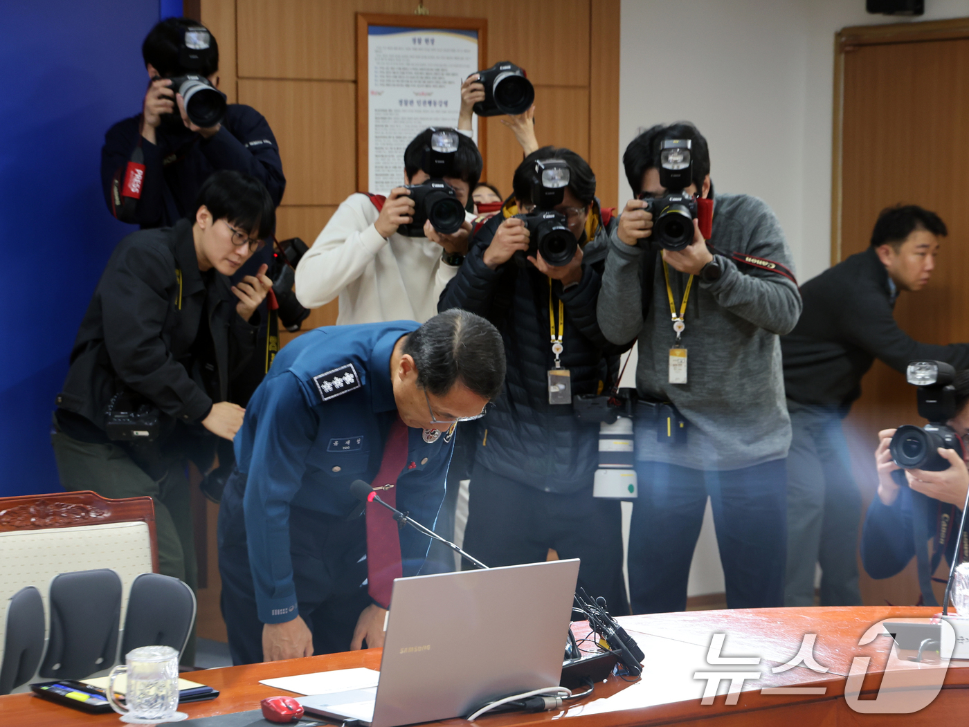 유재성 경찰청장 직무대행이 1일 오전 서울 서대문구 경찰청 무궁화회의실에서 열린 '전국 경찰 지휘부 화상회의'에서 고개 숙여 사과하고 있다. 이날 회의에서 경찰은 '12·3 비상계엄’을 1년 앞두고 국회 출입을 통제한 경찰의 행위에 대해 사과했다. 2025.12.1/뉴스1 ⓒ News1 황기선 기자 |