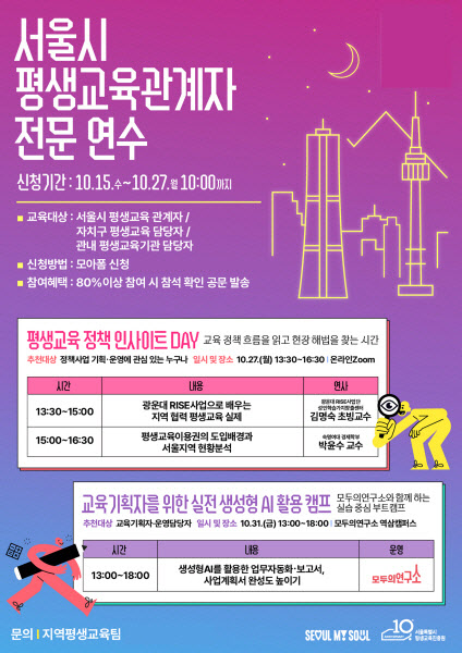 이번 ‘서울시 평생교육관계자 전문 연수’는 서울시 평생교육 관계자와 자치구 평생교육 관계자, 관내 평생교육기관 담당자를 대상으로 진행된 교육이다. 모두의연구소는 이번 연수에서 ‘교육기획자를 위한 실전 생성형 AI 활용 캠프’를 운영했다.