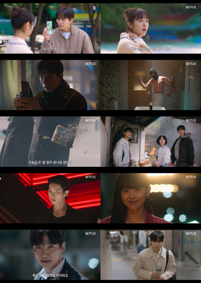 함께 공개된 티저 예고편은 ‘상웅’이 결혼을 약속한 여자친구 ‘민숙’(김혜준)에게 돈을 손에 쥐는 만큼 힘이 생기지만, 그 힘을 쓰면 돈이 사라지는 초능력을 보여주며 시작한다. 힘을 쓰면 쓸수록 가진 돈이 사라지는 초능력을 대단한 능력이 아닌, 그저 ‘고추장과 초고추장’, ‘파리와 초파리’에 비유하며 텅 빈 지갑을 보고 좌절하는 ‘상웅’의 모습이 웃픔을 자아내는 가운데, 날아오는 총알을 한 손으로 잡고, 위험한 적에 거침없이 맞서는 ‘상웅’의 히어로적 면모는 그가 가진 초능력에 대한 궁금증을 끌어올린다. 이어, 초능력을 쓰지 말자는 ‘민숙’의 경고가 무색하게 계속해서 힘을 써야만 하는 상황이 발생하고, 예측불가한 상황 속 등장한 또 다른 초능력자 ‘변호인’(김병철), ‘방은미’(김향기), 그리고 초능력자들을 노리는 ‘조나단’(이채민)과 ‘조안나’(강한나)의 존재는 앞으로 펼쳐질 스토리에 기대감을 높인다. 현실 공감을 불러일 으키는 “월급은 통장을 스치고 오늘도 돈 쓸 일이 끝나질 않는다”의 ‘상웅’의 대사 뒤, 돈을 지키기 위해 힘을 쓰지 않고 조심스레 움직이는 ‘상웅’의 모습은 보는 이들을 웃음 짓게 만들며 지금까지 본 적 없는 생활밀착형 짠내 히어로 ‘캐셔로’의 탄생을 기대하게 만든다.