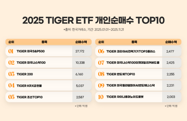 인공지능(AI)·반도체·전력·로봇 등 혁신성장 테마 ETF도 올해 개인 투자자가 적극적으로 담은 분야다. 대표 상품으로는 ‘TIGER 코리아AI전력기기TOP3플러스’, ‘TIGER 반도체TOP10’, ‘TIGER 미국필라델피아AI반도체나스닥 ETF’, ‘TIGER 차이나휴머노이드로봇’ 등이 꼽혔다. 안정적인 월배당 구조로 인기를 얻고 있는 ‘TIGER 미국나스닥100타겟데일리커버드콜 ETF’도 순매수 상위권에 포함됐다.