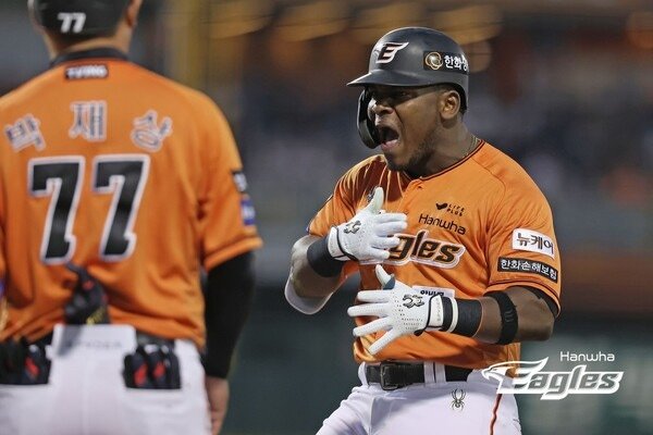 [서울=뉴스핌] 한화의 외국인 타자 루이스 리베라토가 지난 6일 홈런을 기록한 뒤 세리머니 하고 있다. [사진 = 한화] 2025.08.06 wcn05002@newspim.com |