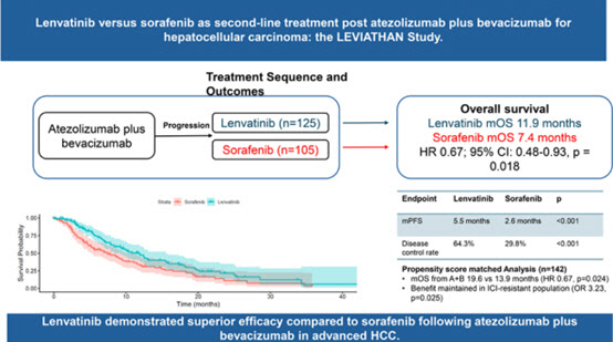 전홍재, 김정선 교수 연구팀은 2018년 5월부터 2024년 10월까지 A+B 치료를 받은 1,210명의 환자 중 230명을 선별해 분석했으며, 이 가운데 125명은 렌바티닙, 105명은 소라페닙을 2차 치료제로 투여했다. 두 치료군 간 특성의 차이를 최소화하기 위해 성향점수 매칭(Propensity Score Matching, PSM) 기법을 적용하여 두 군 간 비교의 객관성을 높였다