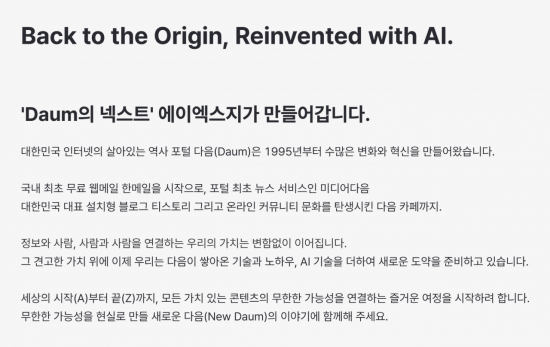 에이엑스지는 "다음이 쌓아온 기술과 노하우, AI 기술을 더하여 새로운 도약을 준비하고 있다"며 "세상의 시작(A)부터 끝(Z)까지, 모든 가치 있는 콘텐츠의 무한한 가능성을 연결하는 즐거운 여정을 시작하려 한다"고 밝혔다.