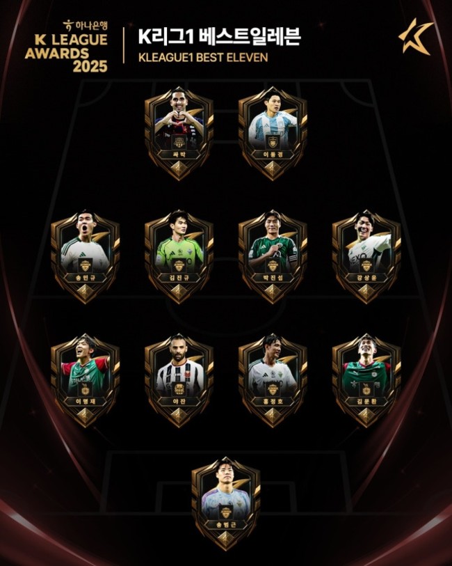 한국프로축구연맹은 1일 '하나은행 K리그1 2025' 베스트 11을 공개했다. 송범근(전북), 이명재(대전), 야잔(서울), 홍정호(전북), 김문환(대전), 송민규(전북), 김진규(전북), 박진섭(전북), 강상윤(전북), 이동경(울산), 싸박(수원FC)이 이름을 올렸다.