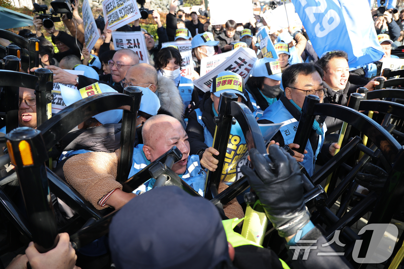 (서울=뉴스1) 허경 기자 = 12·29 무안공항 제주항공 여객기 참사 유가족들이 1일 서울 용산구 전쟁기념관 앞에서 항공철도사고조사위원회(항철위)의 공청회 중단과 조사기구 독립화를 촉구하는 기자회견을 가졌다. 유가족은 기자회견을 마친 뒤 이재명 대통령의 면담을 요청하기 위해 대통령실로 향하자 가로막은 경찰들과 몸싸움을 벌이고 있다. 2025.12.1/뉴스1
