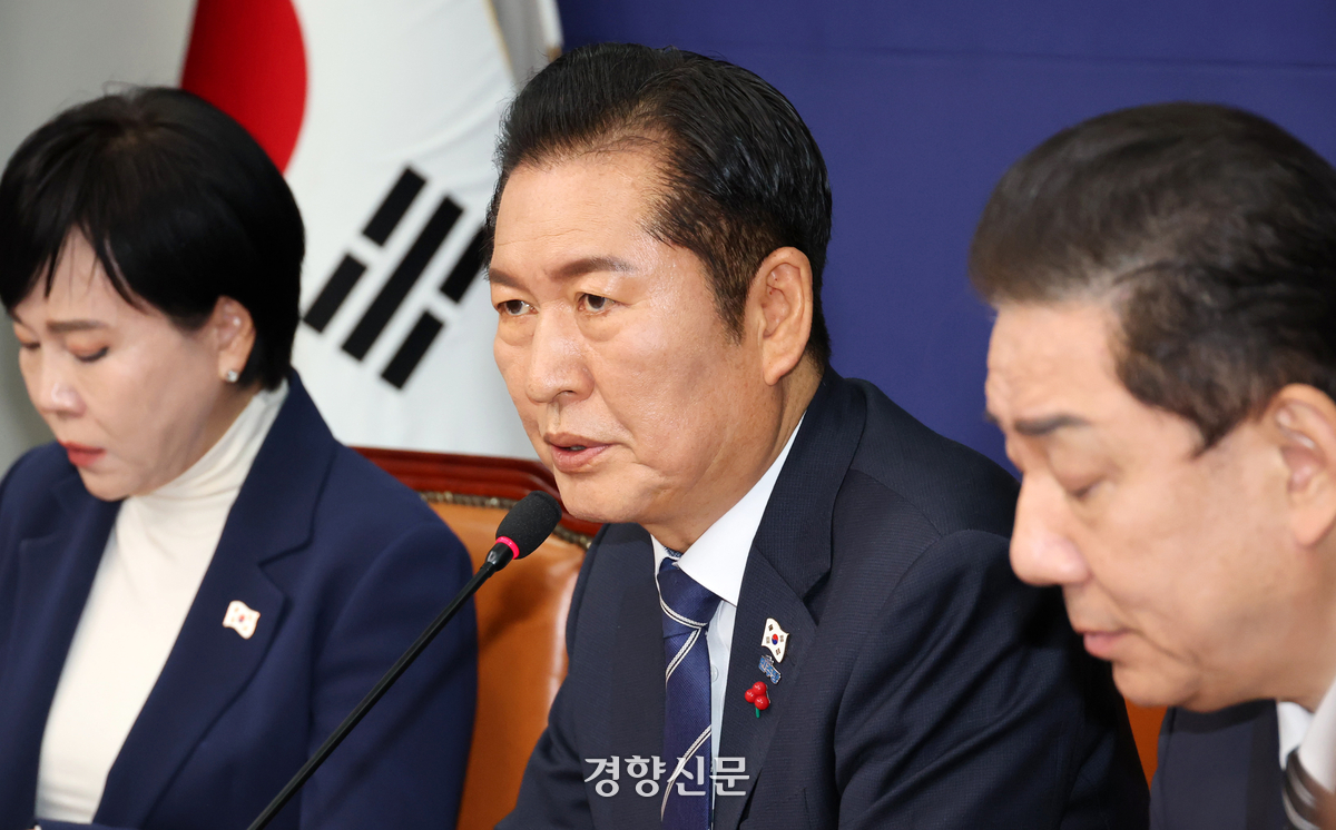 정청래 더불어민주당 대표(가운데)가 1일 국회에서 열린 당 최고위원회의에서 발언하고 있다. 박민규 선임기자 |