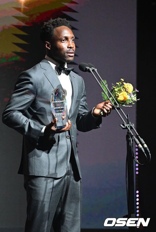 [OSEN=최규한 기자] 1일 오후 서울 홍은동 스위스 그랜드 호텔에서 ‘K리그 어워즈 2025’ 시상식이 열렸다.이날 시상식에는 최우수감독상, 최우수선수상(MVP), 영플레이어상, 베스트11 부문에 뽑힌 각 구단 수상자들과 후보들이 자리를 빛낸다.K리그2 MVP를 거머쥔 인천 제르소가 소감을 전하고 있다. 2025.12.01 / dreamer@osen.co.kr |