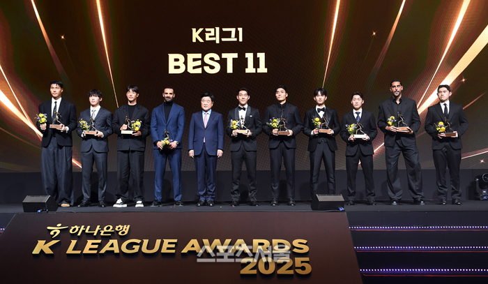 1일 서울 서대문구 스위스그랜드호텔에서 열린 ‘하나은행 K리그 2025 대상 시상식’에서 K리그1 베스트11에 선정된 수상자들이 기념촬영을 하고 있다. 왼쪽부터 전북 현대 송범근, 대전 하나시티즌 이명재, 전북 현대 홍정호, FC서울 야잔, 권오갑 총재, 전북 현대 송민규, 전북 현대 박진섭, 전북 현대 김진수, 전북 현대 강상윤 , 수원FC 싸박, 울산 HD 이동경. 2025. 12. 1. 박진업 기자 upandup@sportsseoul.com |