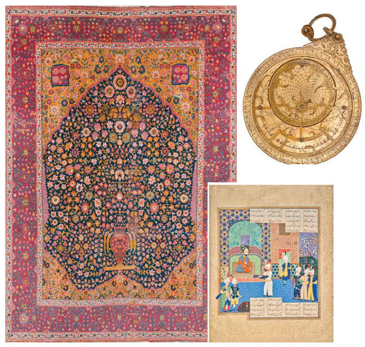 국립중앙박물관 이슬람실에서 전시 중인 18세기 무굴 제국의 '천 송이의 꽃과 벽감무늬 카펫'(왼쪽). 오른쪽 위는 1309~1310년경 제작된 천체 관측기구 '아스트롤라베', 오른쪽 아래는 1525~1540년경 제작된 '샤나메(왕들의 책) 필사본 삽화'. 국립중앙박물관 |