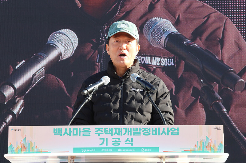 오세훈 서울시장이 1일 서울 노원구 중계본동 일대에서 열린 백사마을 주택 재개발 정비사업 기공식에서 축사를 하고 있다. 연합뉴스 |