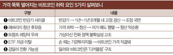 하락장의 기점을 레버리지(차입 기반 투자) 청산 사태로 보는 시선도 있다. 디지털자산 솔루션 기업 헥스트러스트의 알레시오 콰글리니 최고경영자(CEO)는 “10월 10일 비트코인 급락으로 일어난 190억달러(약 27조8000억원) 레버리지 청산 사태로 전환점이 왔다”며 “이번 조정 국면이 당분간 지속돼 7만달러대 초반까지 시험받거나 일시적으로 그 이하로 하락할 수 있다”고 말했다.