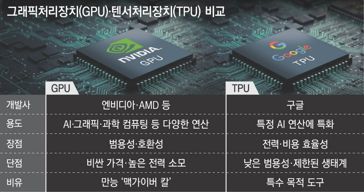 구글이 개발한 텐서처리장치(TPU)가 ‘엔비디아 천하’인 인공지능(AI) 반도체 시장에서 존재감을 키우고 있다. 다만 엔비디아 지위가 역전될 것이라는 전망은 과도하다는 평가가 대체적이다.