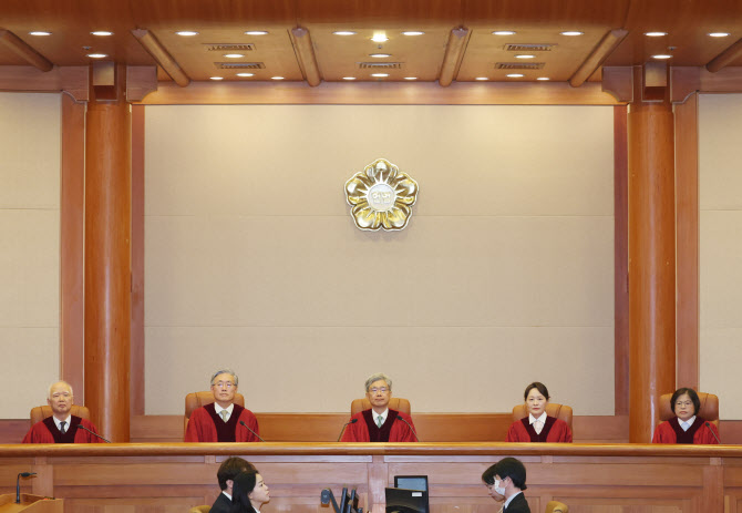 김상환 헌법재판소장 등이 27일 서울 종로구 헌재 대심판정에서 11월 심판사건 선고를 앞두고 자리에 앉아 있다. (사진=연합뉴스) |