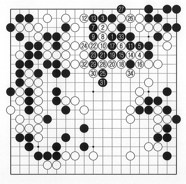백의 활용에 박정환 9단은 흑1, 3으로 최대한 버틴다. 백4, 6은 신진서 9단의 정확한 활용 수순. 얼핏 9도 백1, 3으로 두면 백이 수가 더 많아 보이나, 흑4의 치중이 성립하는 장면이다. 실전 백4, 6을 당한 흑의 최선은 흑7, 9의 단수 교환 후 흑11의 버팀. 흑15, 17로 중앙을 뚫고 나오는 동안 백은 유유히 백18, 22 등을 선수로 활용해 충분하다는 판단이다. 흑23은 평소라면 10도 흑1로 상변을 보강하는 것이 정수이나, 백2로 백돌 넉 점을 살리며 끝내기에 들어서면 백10까지 백이 5집가량 남는 형세. 박정환 9단이 실전 흑23, 25로 버텨가자, 신진서 9단은 백28, 30에 끊어 상변 수상전 자충을 이용한 늘어진패를 결행할 준비를 마쳤다.