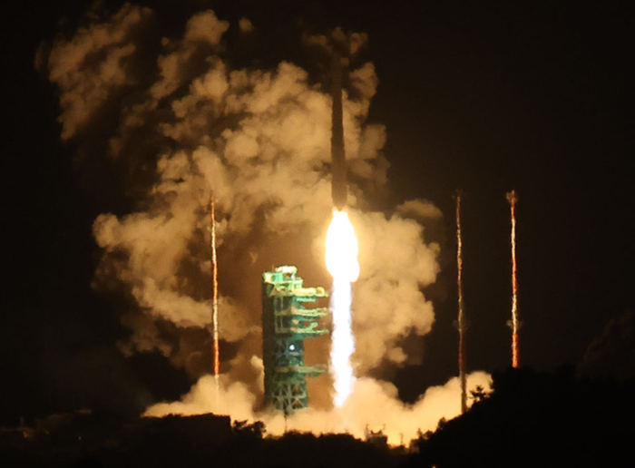 한국형발사체 누리호가 지난달 27일 주탑재위성 ‘차세대중형위성 3호’와 부탑재위성 12기 등 총 13기 위성이 싣고 새벽 전남 고흥군 나로우주센터에서 발사되고 있다. [연합뉴스] |