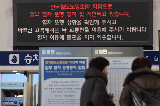 전국철도노동조합(철도노조) 총파업이 나흘째 이어지고 있던 지난해 12월 8일 오후 서울역전광판에 '파업에 따른 운행중지 열차 안내문'이 나타나고 있다. 뉴스1 |