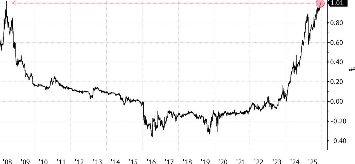 일본 2년물 국채 금리. 단위 %. 1일 장중 고점 1.010%. 출처 블룸버그 |