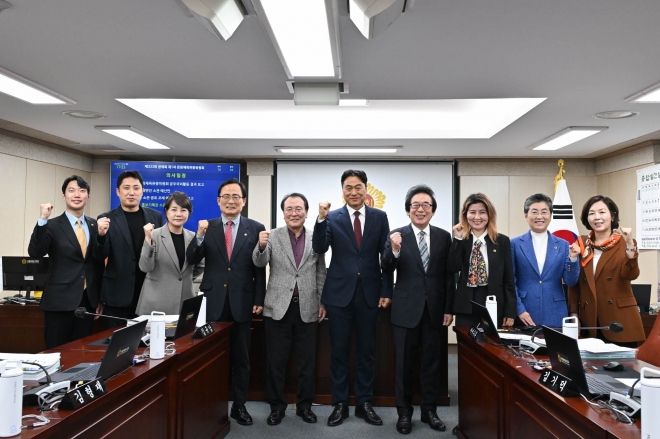 제11대 후반기 서울시의회 문화체육관광위원회 위원들이 주먹을 불끈 쥐고 활짝 웃고 있다. 서울시의회 제공 |