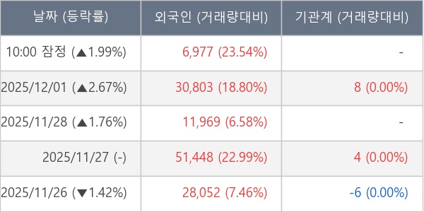 [서울=뉴스핌] 로보뉴스 = 02일 10시 15분 현재 동아화성(041930)은 전일 대비 1.99% (현재가 6,670원) 상승했고, 외국인이 최근 5일 연속 순매수(누적 12.92만 주, 잠정) 행진을 하고 있다.