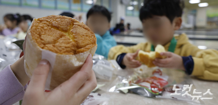 급식, 돌봄 등의 업무를 담당하는 학교 비정규직 노동자들이 파업에 참여하면서 급식 운영에 일부 차질이 생긴 가운데 6일 서울의 한 초등학교 급식실에서 학생들이 배식받은 빵과 음료로 점심을 먹고있다. 사진공동취재단 |