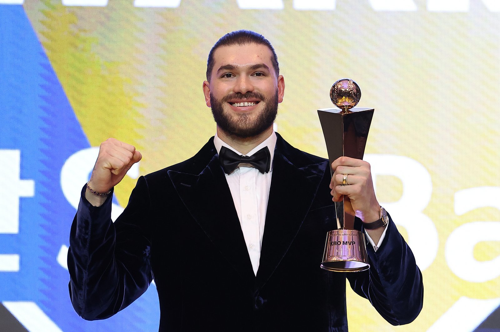 폰세가 지난달 24일 서울 송파구 롯데호텔 월드에서 열린 2025 프로야구 시상식에서 최우수선수(MVP)로 선정된 뒤 트로피를 들고 기념 촬영을 하고 있다. 뉴스1 |