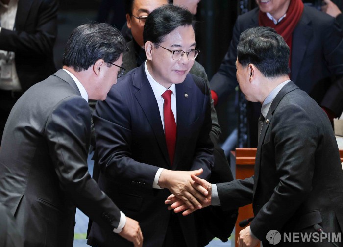 [서울=뉴스핌] 윤창빈 기자 = 송언석 국민의힘 원내대표가 2일 서울 여의도 국회에서 열린 의원총회에서 동료 의원들과 인사를 하고 있다. 2025.12.02 pangbin@newspim.com