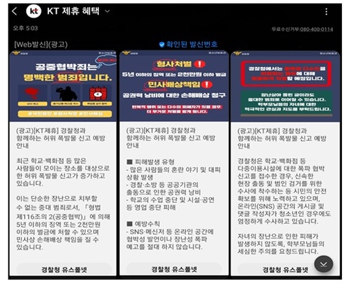 경찰청이 KT와 협업해 보내는 허위 폭발물 신고 예방 안내 문자 |