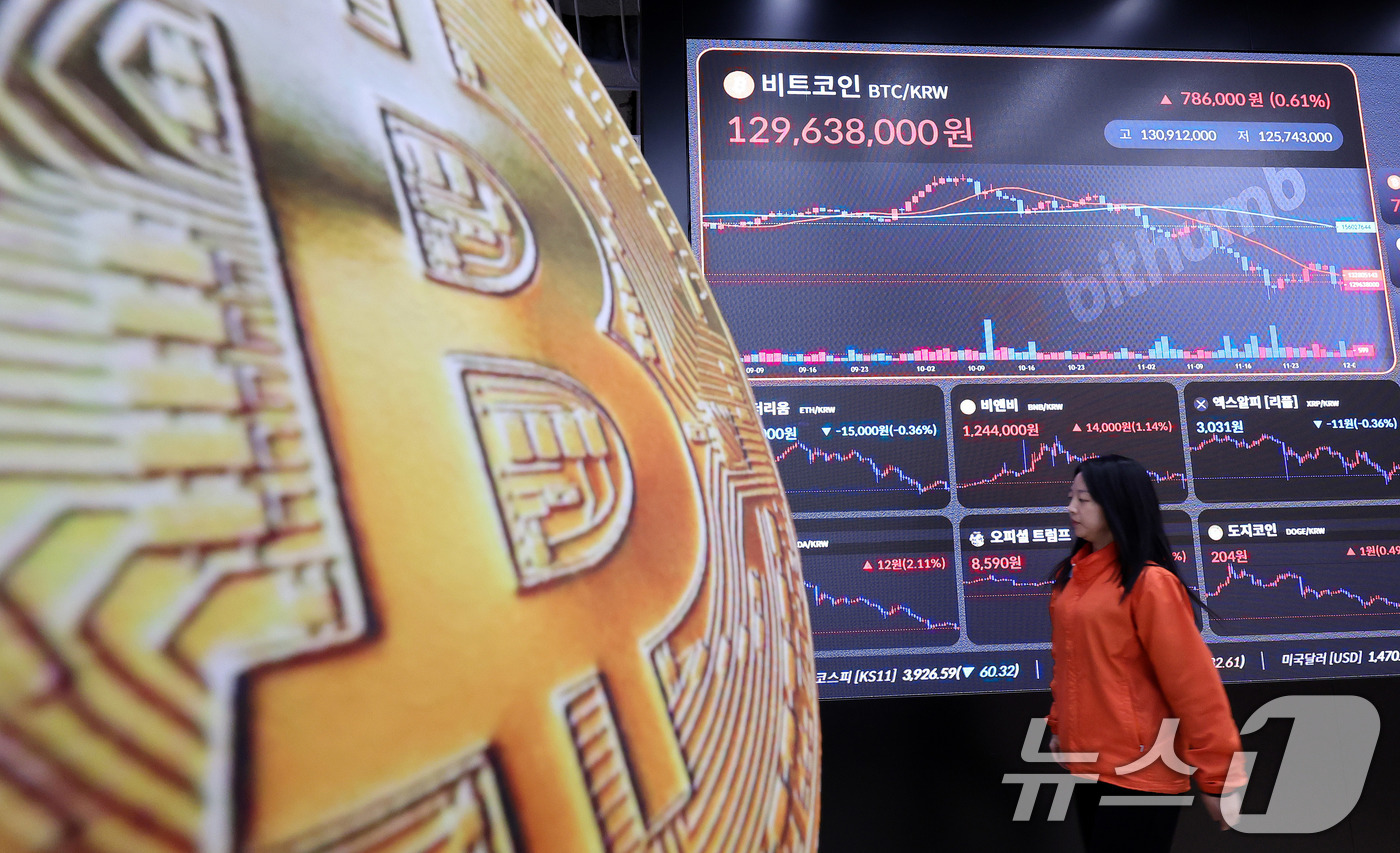 (서울=뉴스1) 박지혜 기자 = 2일 서울 강남구 빗썸 라운지 전광판에 비트코인 시세가 나타나고 있다. 비트코인이 상승 전환하며 암호화폐(가상화폐) 시장의 낙폭이 크게 줄고 있다. 전날 비트코인은 8% 넘게 급락해 8만4000달러 선이 붕괴됐었다. 2025.12.2/뉴스1