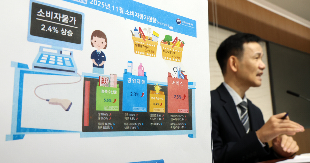 국가데이터처가 2일 발표한 '11월 소비자물가동향'에 따르면, 지난달 소비자물가지수는 117.20(2020=100)으로 전년 동월 대비 2.4% 상승했다. 물가 상승률은 10월(2.4%)에 이어 두 달 연속 2% 중반대다.