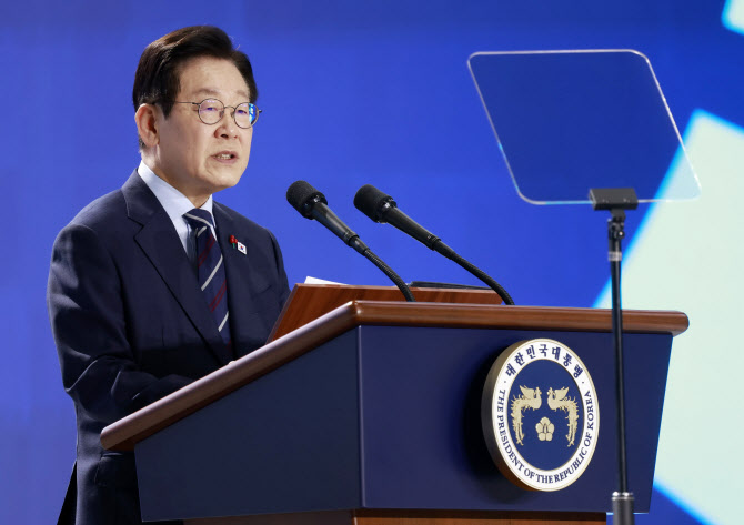 민주평화통일자문회의 의장인 이재명 대통령이 2일 경기 고양시 킨텍스에서 열린 제22기 민주평통 출범식에서 의장연설을 하고 있다.(사진=연합뉴스) |
