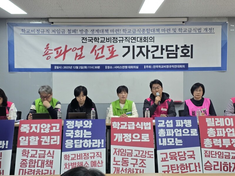 2일 박정호 전국학교비정규직노동조합(학비노조) 정책실장이 서울 서대문구 민주노총 전국서비스산업노동조합연맹 대회의실에서 열린 ‘전국학교비정규직연대회의(연대회의) 총파업 선포 기자간담회’에서 이렇게 말했다. 학비노조를 비롯해 공공운수노조 전국교육공무직본부, 전국여성노동조합이 참여한 연대회의 소속 학교 비정규직 노동자 10만명은 오는 4~5일 총파업을 예고하고 있다. 지난달 20∼21일에 이어 두번째 파업이다. 연대회의는 최저임금에도 못 미치는 기본급 인상, 방학 중 무임금 문제 등을 해결하라고 촉구하고 있으나, 교섭 대상인 교육부·시교육청과 접점을 찾지 못했기 때문이다.