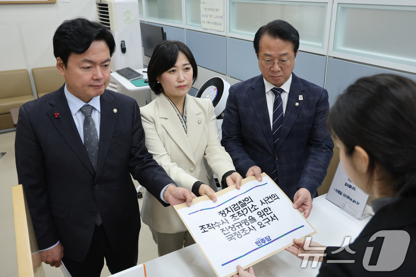 뒤이어 민주당도 의안과를 찾아 단독으로 '정치 검찰의 조작 수사·조작 기소 사건의 진상 규명을 위한 국정조사 요구서'를 제출했다. 이 자리에는 문금주·김현정·백승아 원내대변인이 자리했다.