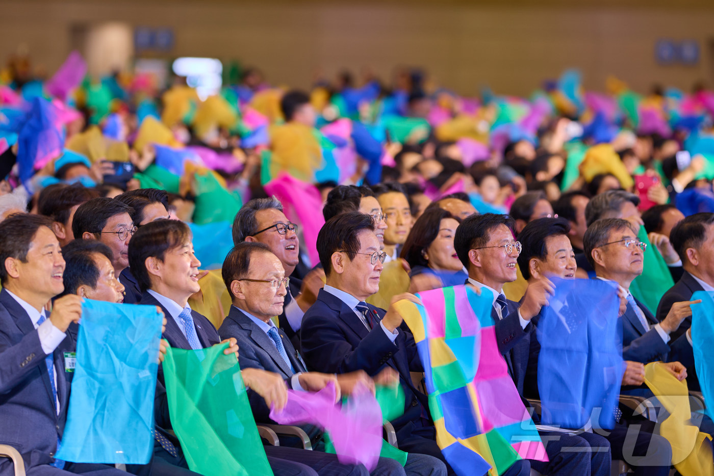 (서울=뉴스1) 이재명 기자 = 이재명 대통령이 2일 경기 고양시 킨텍스에서 열린 제22기 민주평화통일자문회의 출범회의에서 이해찬 수석부의장 등 참석자들과 '함께하는 다짐, 함께 부르는 평화' 대합창을 하고 있다. (대통령실 제공. 재판매 및 DB 금지) 2025.12.2/뉴스1