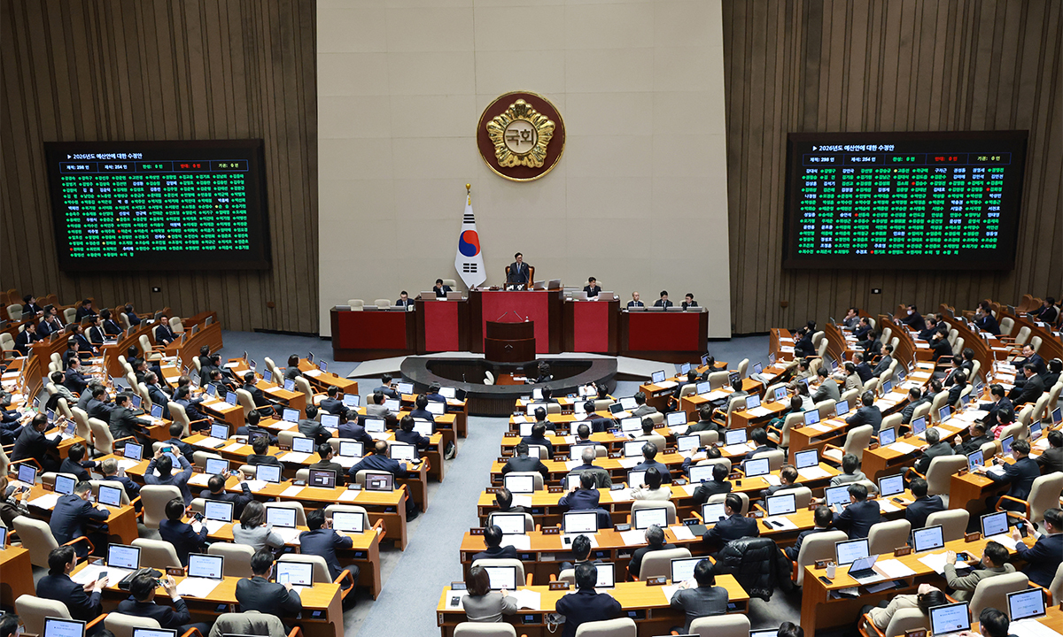 예산안 처리 법정 시한인 2일 국회 본회의에서 2026년도 예산안에 대한 수정안이 찬성 262인, 반대 8인, 기권 6인으로 가결되고 있다. 연합뉴스 |