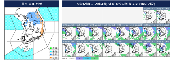 모레(4일) 오후부터 밤 사이에는 중부지방(강원동해안 제외), 전북, 전남북부, 경북서부내륙 등지에도 눈이나 비가 이어질 것으로 전망돼 실시간 기상정보 확인이 필요하다.