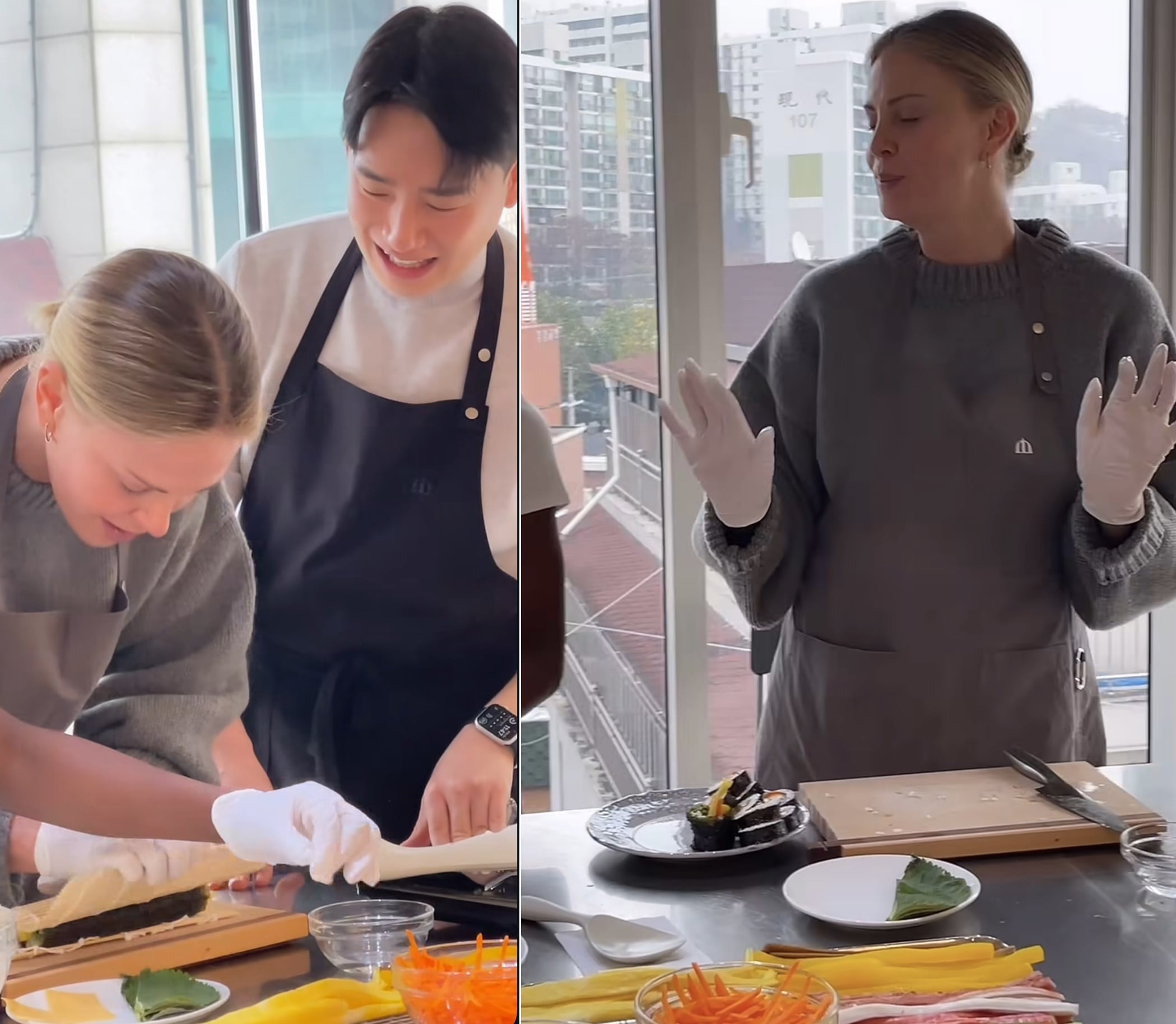 배우 샤를리즈 테론이 지난달 말 서울 성동구의 쿠킹 클래스에서 김밥 마는 법을 배우고 있다. /인스타그램 |