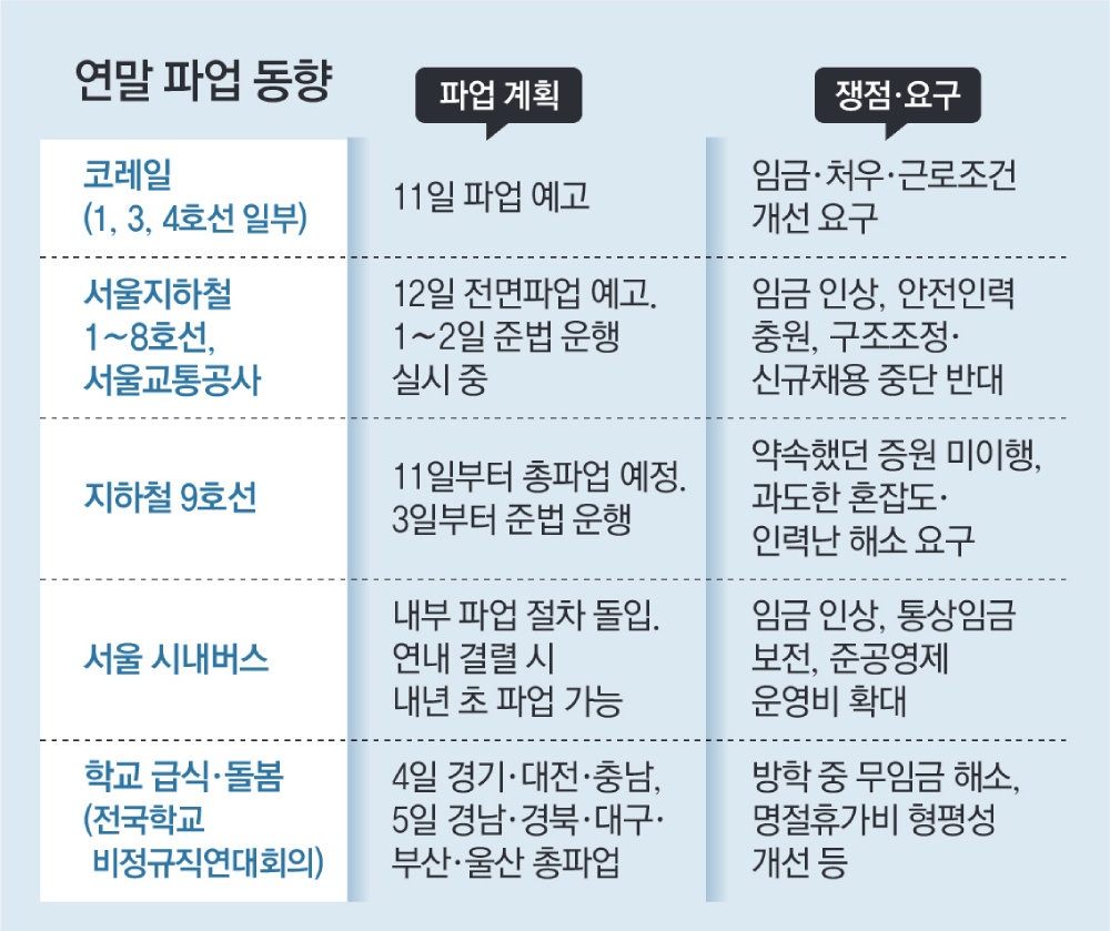 연말을 앞두고 철도·도시철도, 학교 급식·돌봄 등 공공서비스 전반에서 파업이 잇따라 예고되면서 시민 불편이 불가피해졌다.