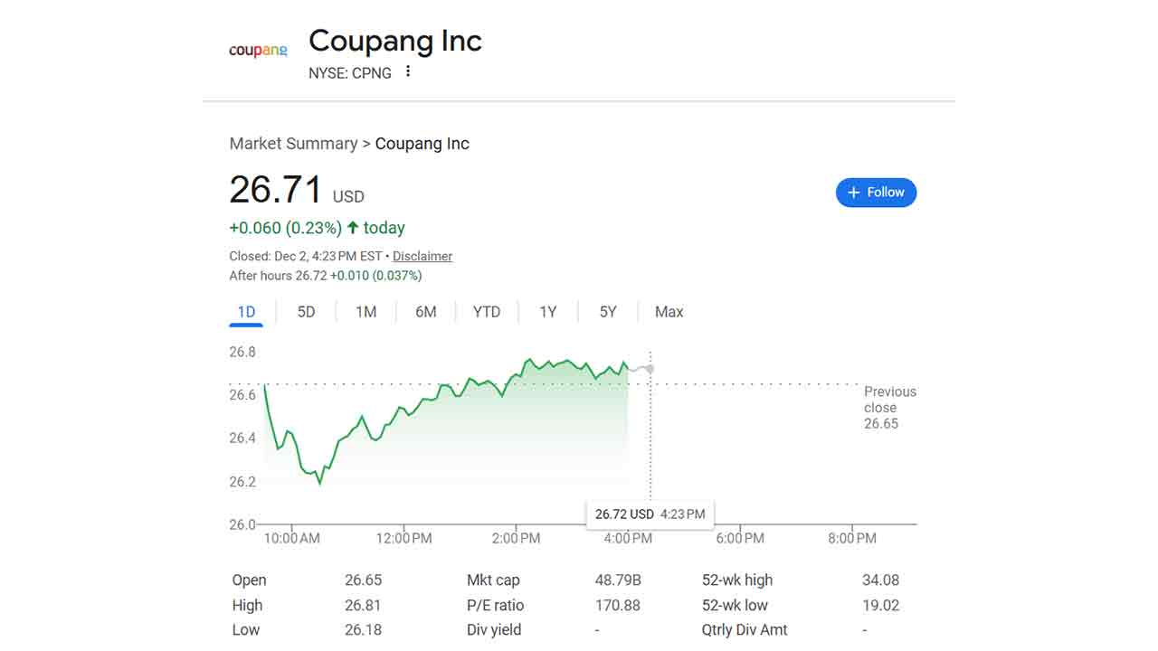 뉴욕 증시에서 쿠팡은 전장보다 0.23% 오른 26.71달러에 거래를 마쳤습니다.
