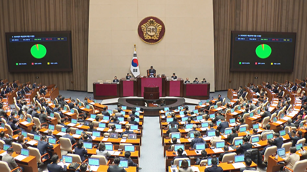 [우원식/국회의장 (어젯밤) : 재석 262인 중 찬성 248인, 반대 8인, 기권 6인으로서 2026년도 예산안에 대한 수정안은 가결되었음을 선포합니다.]