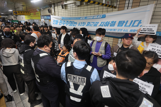 전국장애인차별철폐연대(전장연) 회원들이 지난 4월 21일 서울 지하철 4호선 혜화역에서 열린 제62차 '출근길 지하철 탑니다' 시위 중 서울교통공사 관계자들과 대치하고 있는 모습. 〈자료사진=연합뉴스〉 |