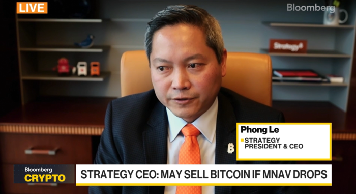 퐁 레 스트래티지 CEO가 2일(현지시간) 블룸버그 TV 인터뷰에서 발언하고 있다. 그는 14억 달러의 예비비를 통해 비트코인 강제 매각을 막겠다고 강조했으나, 화면 자막처럼 MNAV(순자산가치)가 급락할 경우 최후의 수단으로 매각을 고려할 수 있음을 시사하기도 했다. [출처=블룸버그TV] |