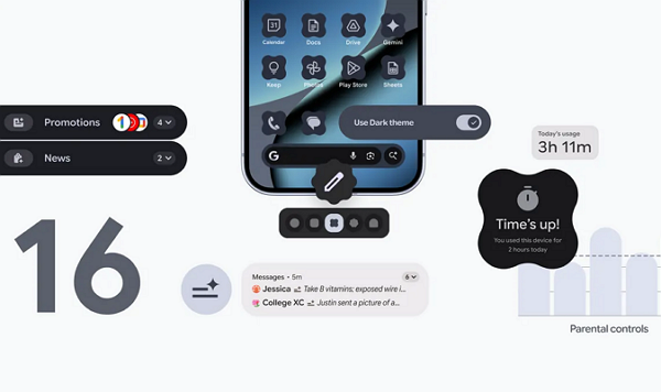 또한 새로운 알림 정리 기능도 추가된다. 프로모션, 뉴스, 소셜 미디어 알림 등 우선순위가 낮은 알림을 자동으로 그룹화하고 음소거해 사용자 경험을 개선한다. 안드로이드16에는 맞춤형 아이콘과 테마로 홈 화면을 개인화하는 기능도 포함됐으며, 확장된 다크 모드가 추가돼 기본적으로 다크 모드를 지원하지 않는 앱도 어둡게 조정할 수 있다.