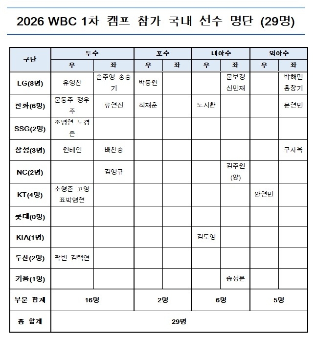 1차 캠프에 참가하는 국내 선수단은 투수 16명, 야수 13명 등 총 29명으로 구성됐다.