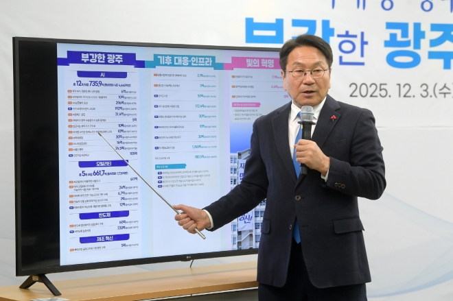 강기정 광주시장이 3일 오후 시청 비즈니스룸에서 2026년 국비예산 관련 기자회견을 하고 있다. 광주광역시 제공 |