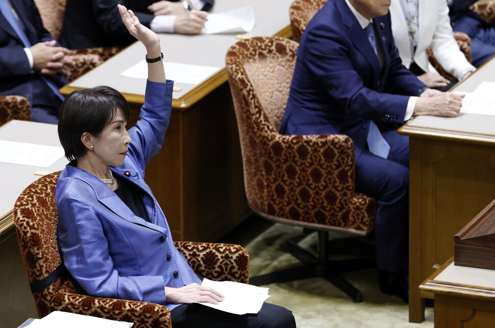 다카이치 사나에 일본 총리가 지난달 26일 국회에 출석해 야당 대표들의 질문에 답하기 위해 손을 들고 있다. EPA 연합뉴스 |