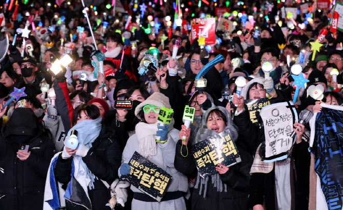 지난해 서울 여의도 국회의사당 앞에서 열린 윤석열 즉각 탄핵 범국민 촛불대행진에 참여한 시민들이 윤석열 전 대통령에 대한 탄핵소추안이 가결된 후 환호하고 있다(사진=방인권 기자). |
