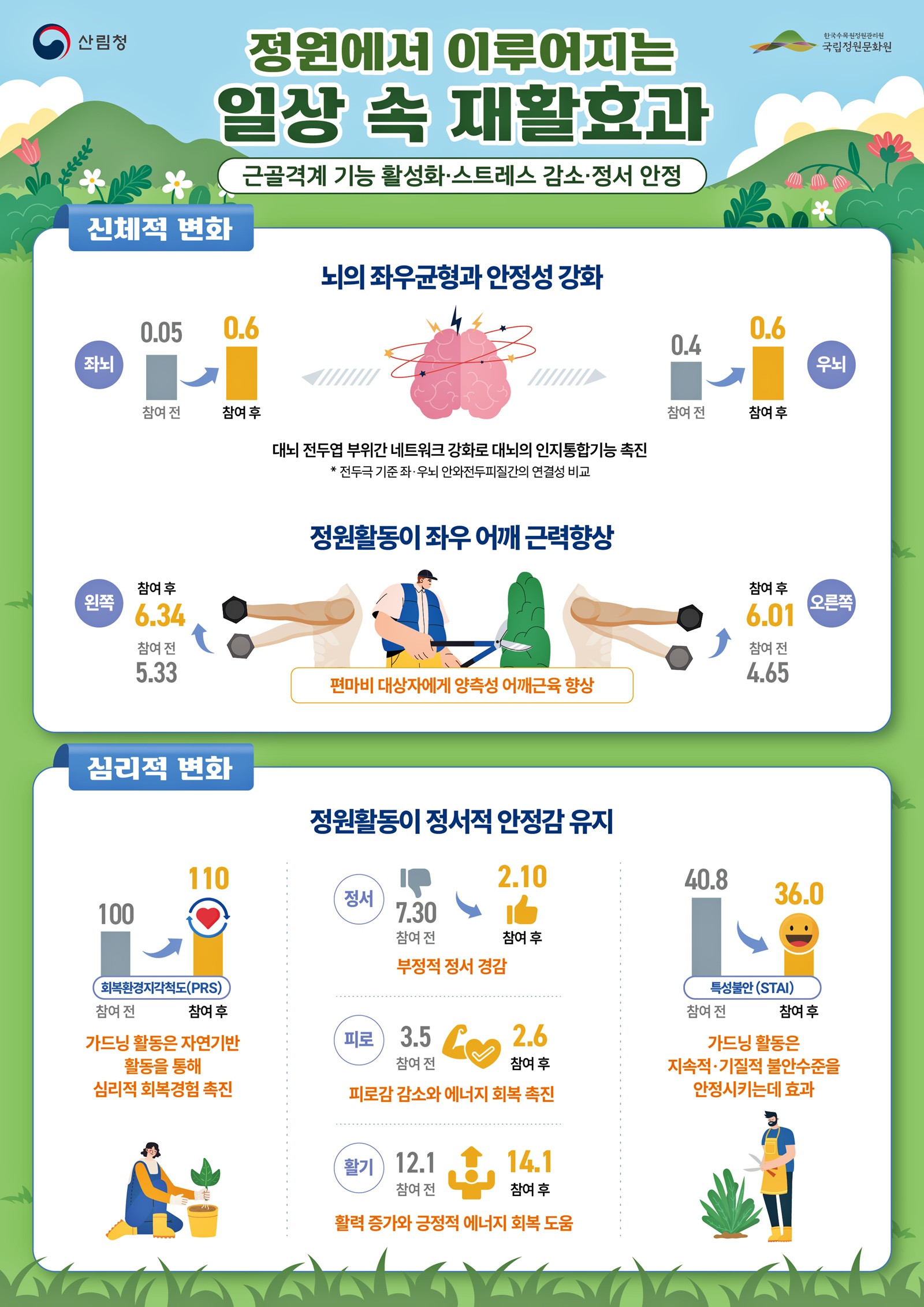산림청은 이번 검증 결과를 바탕으로 정원 치유 프로그램을 고도화하고, 내년부터는 사회적 질병 해소를 위해 수혜 대상자를 자살 고위험군 등으로 확대할 계획입니다.